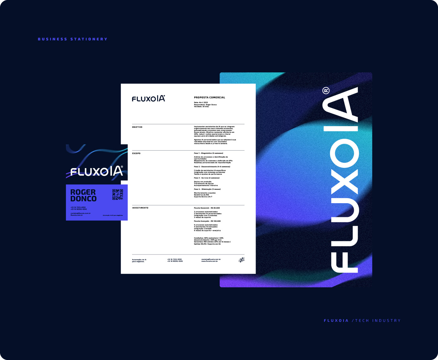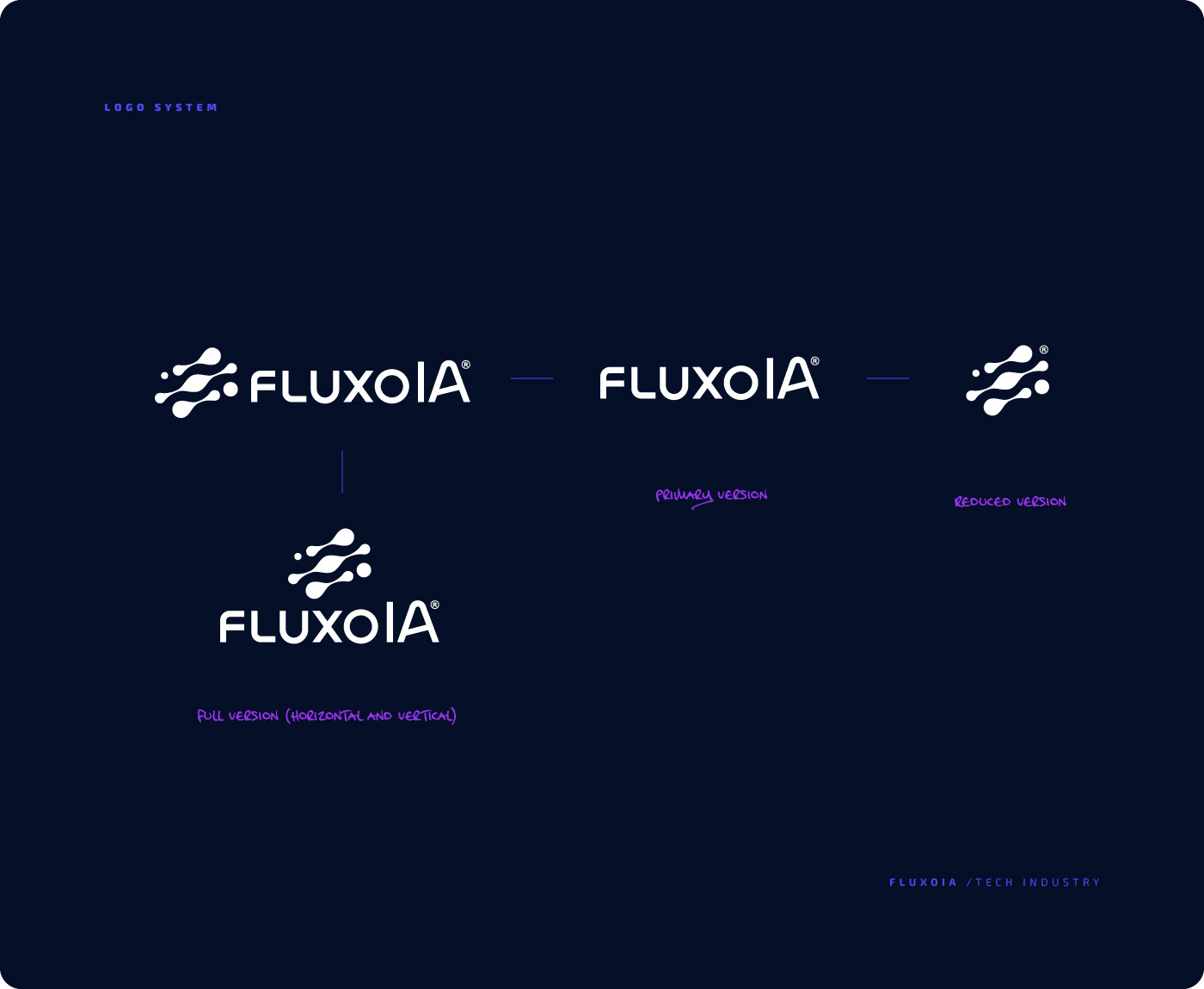 FluxoIA is a technology company specialized in process automation through artificial intelligence assistants. Their competitive advantage lies in the organic integration of AI agents into clients' systems, adapting to business realities without compromising existing workflows. The company sought an identity that balanced technological innovation with commercial accessibility.