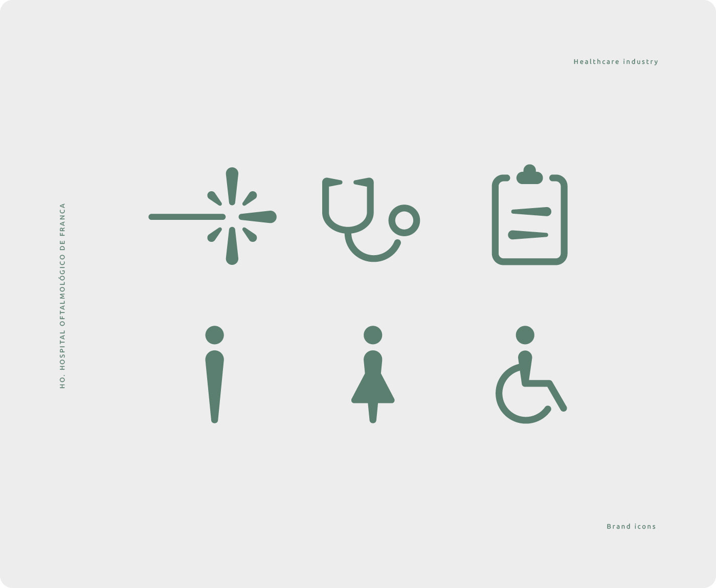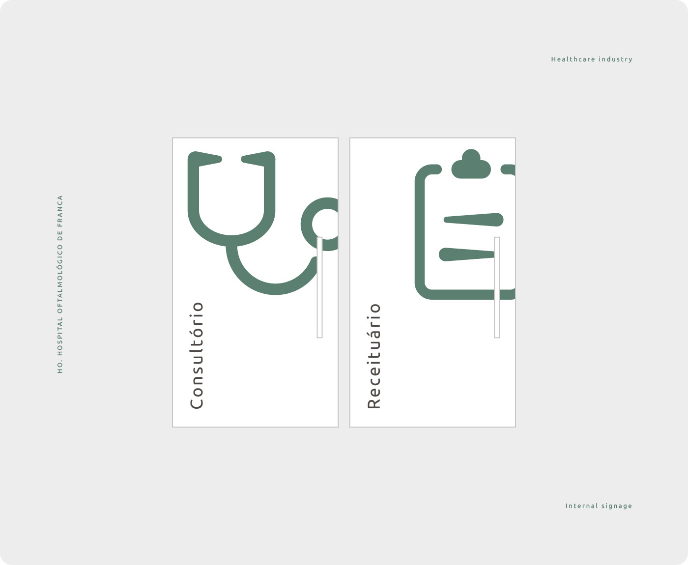 Our solution was developing a visual identity centered on the logo, highlighting the H.O. initials through neutral, legible typography, complemented by a sober palette with predominant aqua green, white, and gray as supporting colors. The minimalist design conveys hospital seriousness and cleanliness combined with technology and modernity. We also created icons for internal signage, maintaining visual coherence across all elements.