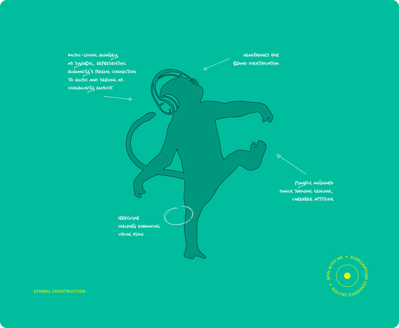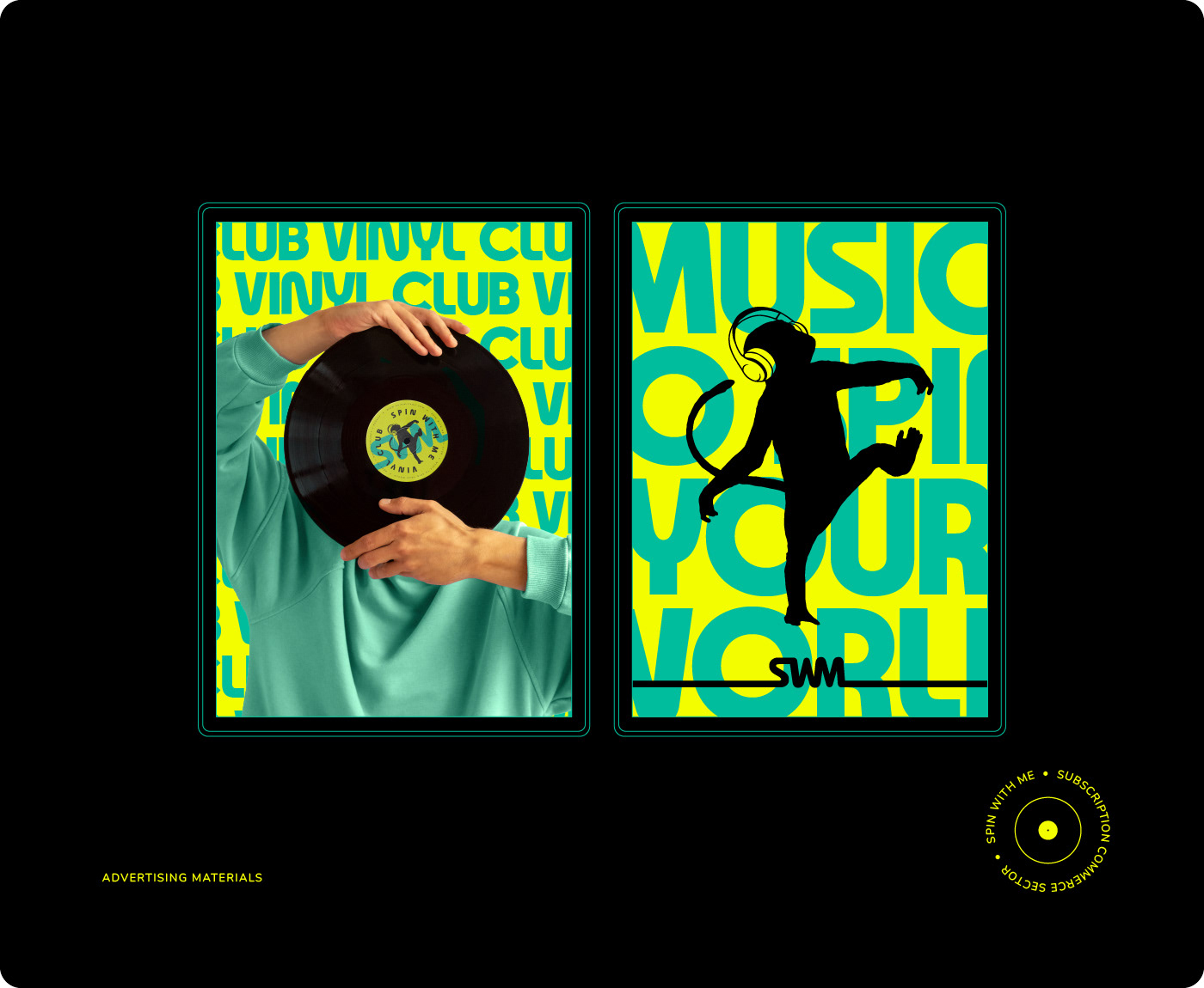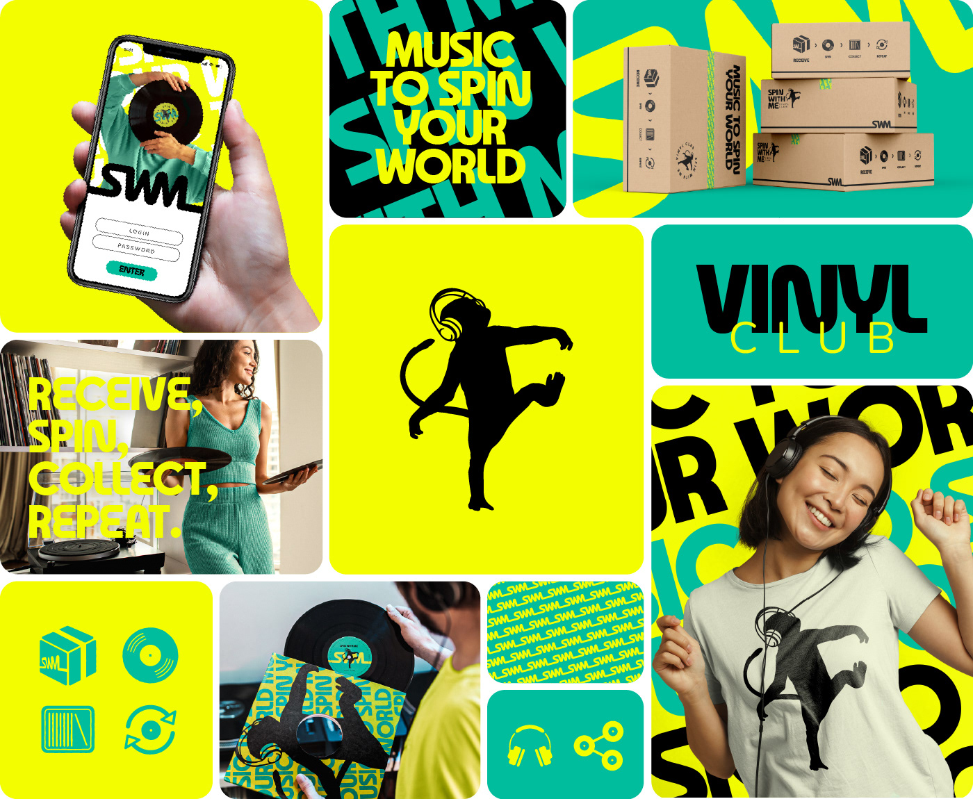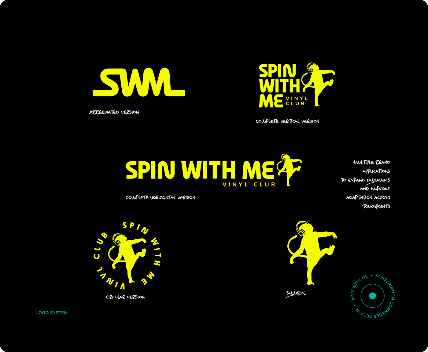 We developed a visual identity that celebrates both vinyl's materiality and contemporary digital energy: a design that blends retro and modern through a saturated palette and vibrant language. We explored the dynamics of the name "Spin With Me" through bold typography that becomes the visual foundation across all applications, complemented by the slogan "Music to spin your world," which reinforces the transformative proposition of the musical experience. We created an icon symbolizing unity and universal passion: a monkey listening to music and dancing with headphones, representing the primal instinct that music awakens, broadly explorable in merchandising.
