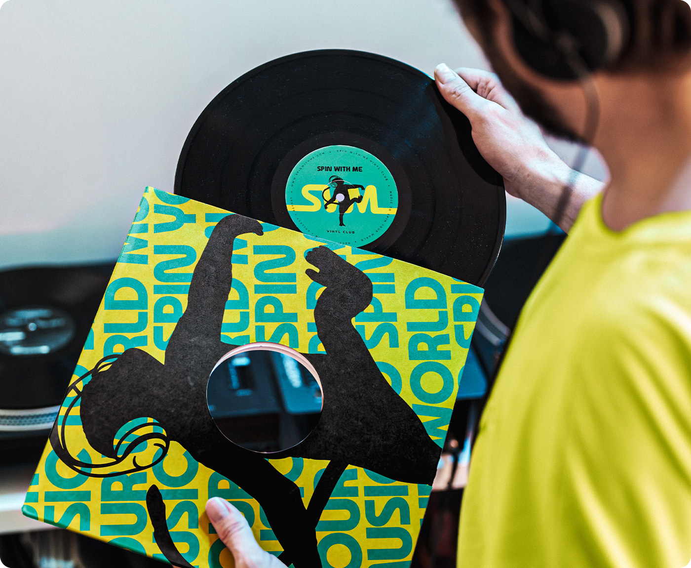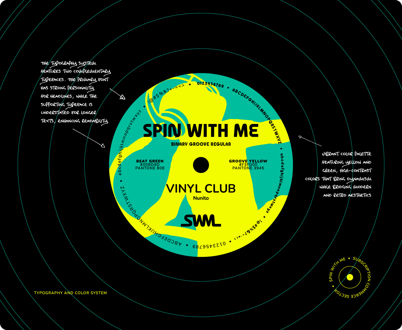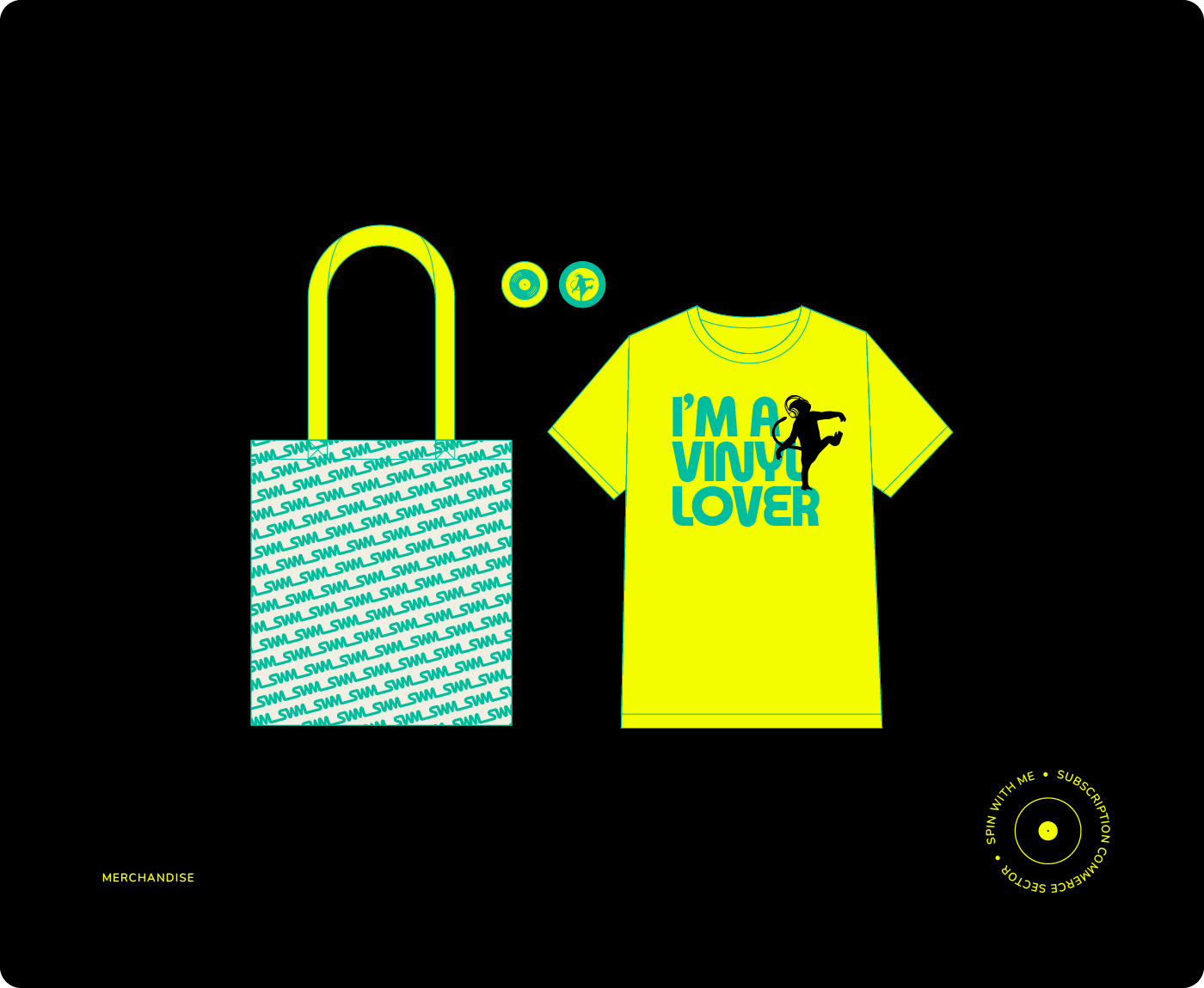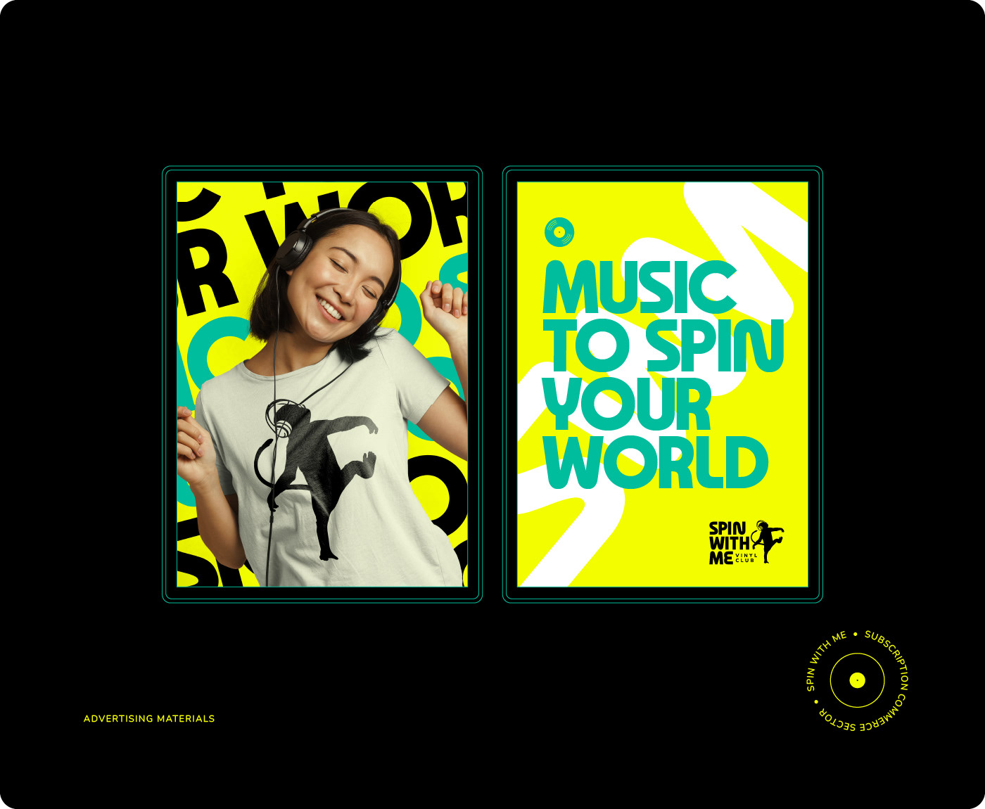 We developed a visual identity that celebrates both vinyl's materiality and contemporary digital energy: a design that blends retro and modern through a saturated palette and vibrant language. We explored the dynamics of the name "Spin With Me" through bold typography that becomes the visual foundation across all applications, complemented by the slogan "Music to spin your world," which reinforces the transformative proposition of the musical experience. We created an icon symbolizing unity and universal passion: a monkey listening to music and dancing with headphones, representing the primal instinct that music awakens, broadly explorable in merchandising.