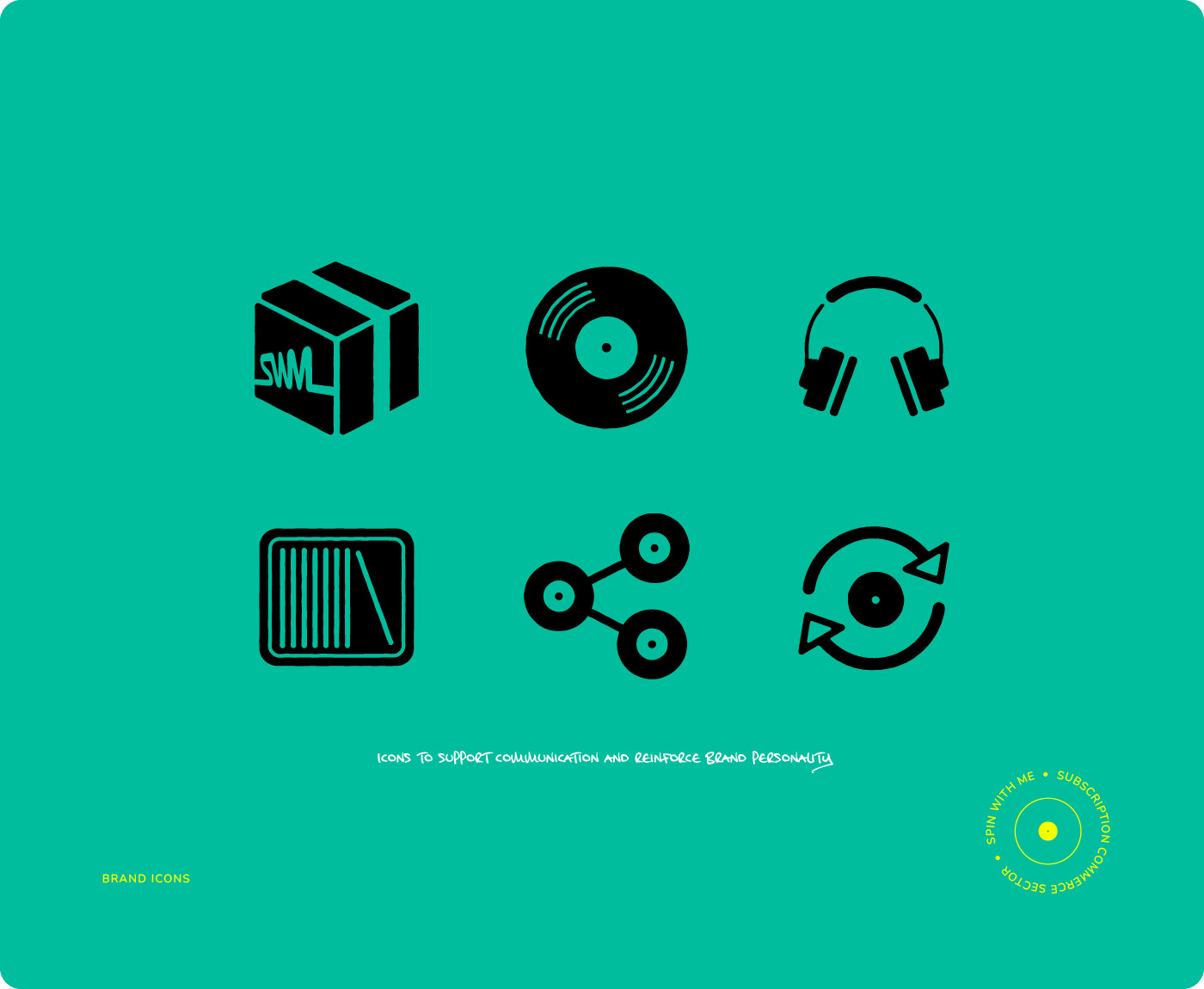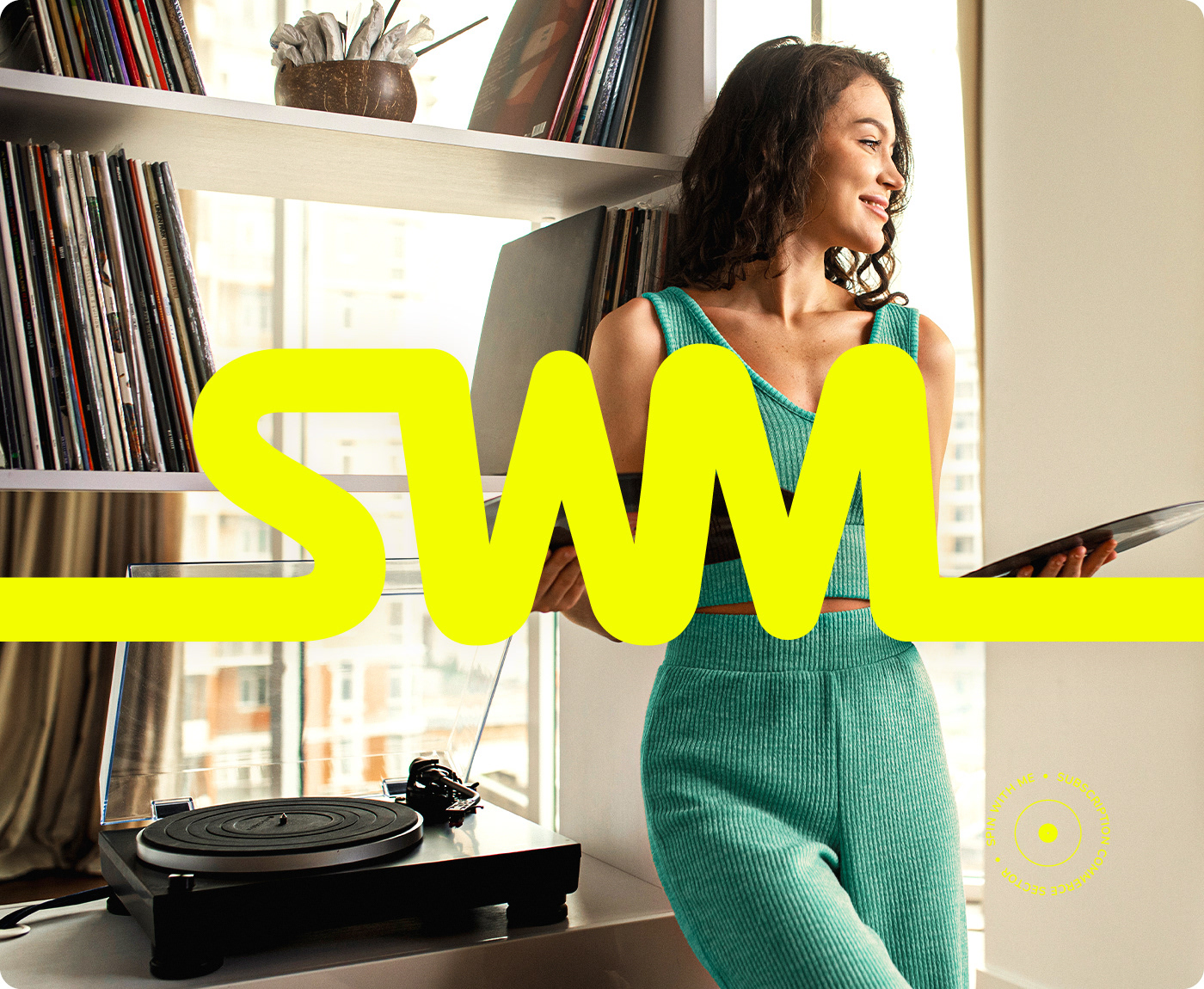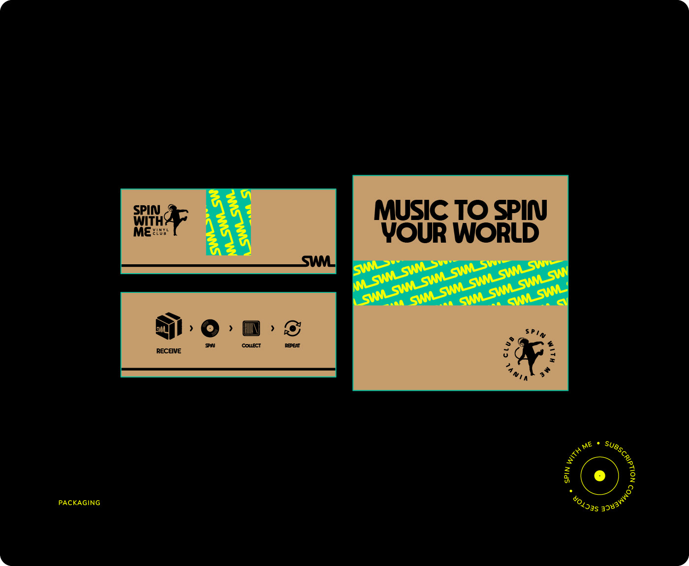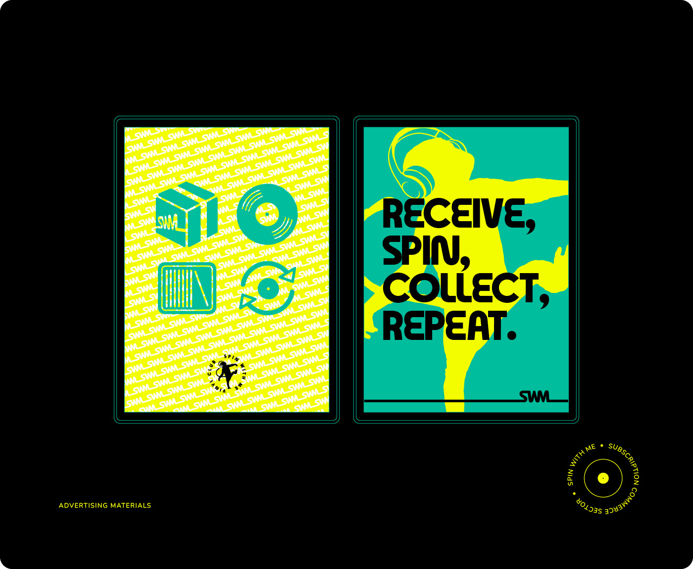 We developed a visual identity that celebrates both vinyl's materiality and contemporary digital energy: a design that blends retro and modern through a saturated palette and vibrant language. We explored the dynamics of the name "Spin With Me" through bold typography that becomes the visual foundation across all applications, complemented by the slogan "Music to spin your world," which reinforces the transformative proposition of the musical experience. We created an icon symbolizing unity and universal passion: a monkey listening to music and dancing with headphones, representing the primal instinct that music awakens, broadly explorable in merchandising.