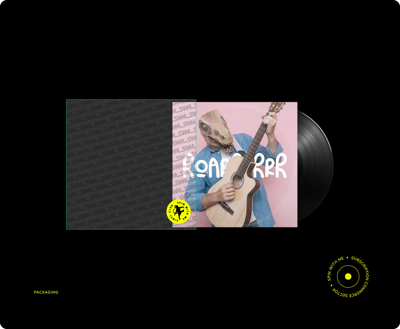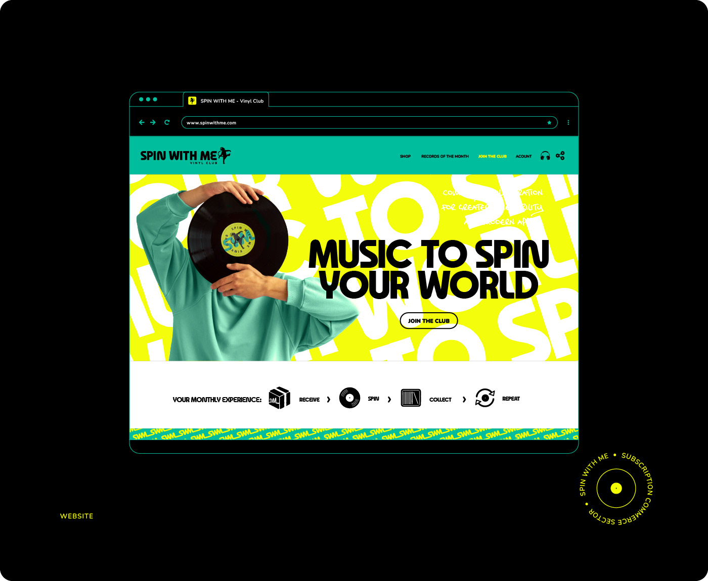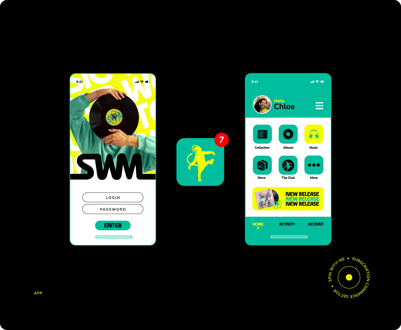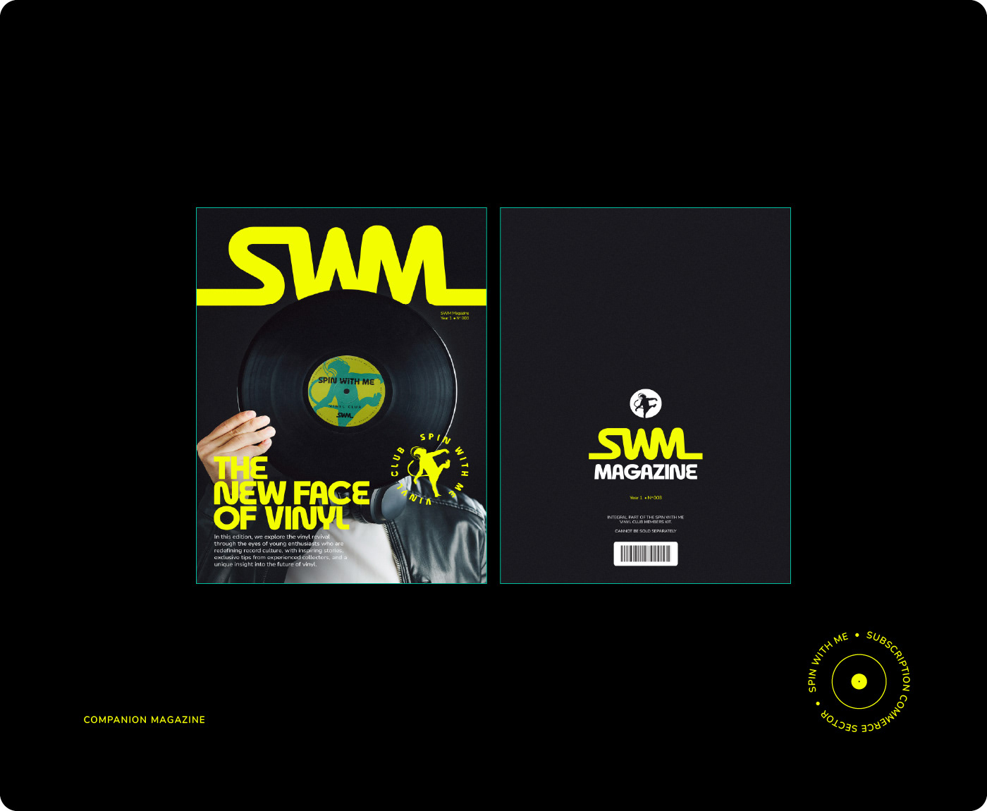 Spin With Me is a vinyl club with a monthly subscription model that delivers exclusive albums, magazines, and special gifts, connecting an enthusiast community through an app. The challenge was transforming individual music consumption into a collective, tangible experience, creating real connections between people through the physical format.